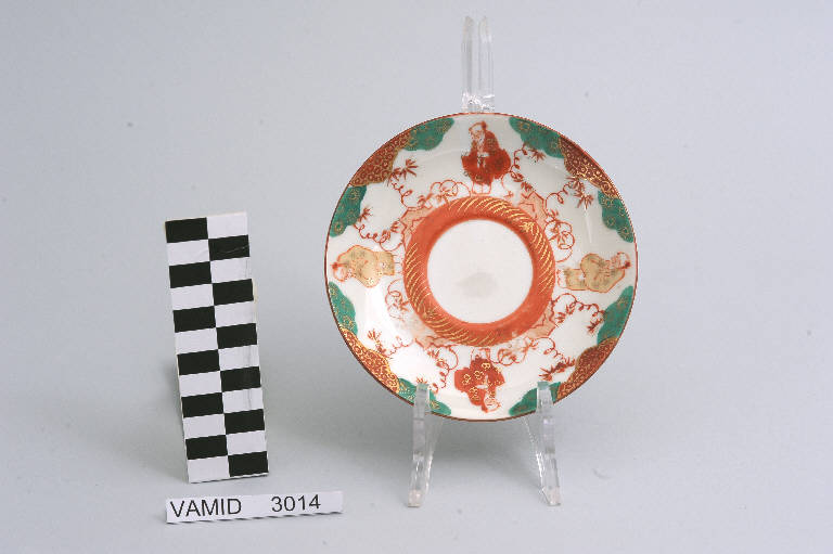- NOTIZIE STORICO CRITICHE Il piattino, appartenente ad un servizio da thè composto da ventuno elementi (nn. inv. 3012-3032), è decorato sottosmalto nei colori verde, rosso, ocra e pesca e rifinita soprasmalto con filettatura rossa. Il marchio non identificato presente su alcuni pezzi del servizio permette comunque di escludere una manifattura lavenese. L'influenza dell'arte giapponese in Occidente cominciò a farsi sentire dalla seconda metà dell'Ottocento e durò sino ai primi decenni del Novecento. La forma semplice e globulare del manufatto, indicante ormai una piena assimilazione del funzionalismo, e la tipologia del decoro suggeriscono una datazione tra gli anni '30 e '40 del Novecento. Il piattino fa parte di una donazione di privati al Museo.