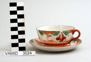 - NOTIZIE STORICO CRITICHE La tazza, appartenente ad un servizio da thè composto da ventuno elementi (nn. inv. 3012-3032), è decorata sottosmalto nei colori verde, rosso, ocra e pesca e rifinita soprasmalto con filettatura rossa. Il marchio non identificato presente su alcuni pezzi del servizio permette comunque di escludere una manifattura lavenese. L'influenza dell'arte giapponese in Occidente cominciò a farsi sentire dalla seconda metà dell'Ottocento e durò sino ai primi decenni del Novecento. La forma semplice e globulare del manufatto, indicante ormai una piena assimilazione del funzionalismo, e la tipologia del decoro suggeriscono una datazione tra gli anni '30 e '40 del Novecento. La tazza fa parte di una donazione di privati al Museo.