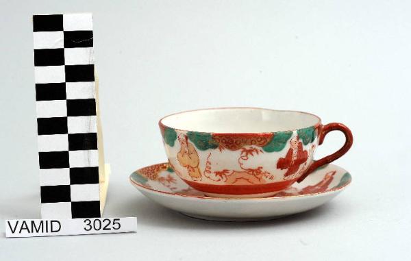 - NOTIZIE STORICO CRITICHE La tazza, appartenente ad un servizio da thè composto da ventuno elementi (nn. inv. 3012-3032), è decorata sottosmalto nei colori verde, rosso, ocra e pesca e rifinita soprasmalto con filettatura rossa. Il marchio non identificato presente su alcuni pezzi del servizio permette comunque di escludere una manifattura lavenese. L'influenza dell'arte giapponese in Occidente cominciò a farsi sentire dalla seconda metà dell'Ottocento e durò sino ai primi decenni del Novecento. La forma semplice e globulare del manufatto, indicante ormai una piena assimilazione del funzionalismo, e la tipologia del decoro suggeriscono una datazione tra gli anni '30 e '40 del Novecento. La tazza fa parte di una donazione di privati al Museo.