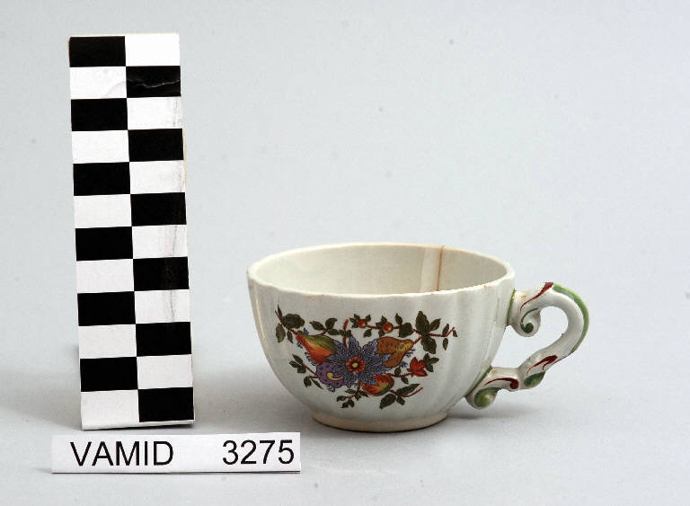 Tazzina da caffè con corpo leggermente svasato; manico a "C" schiacciato decorato con piccole volute contrapposte; fondo bianco con motivo decorativo vegetale policromo all'esterno.
