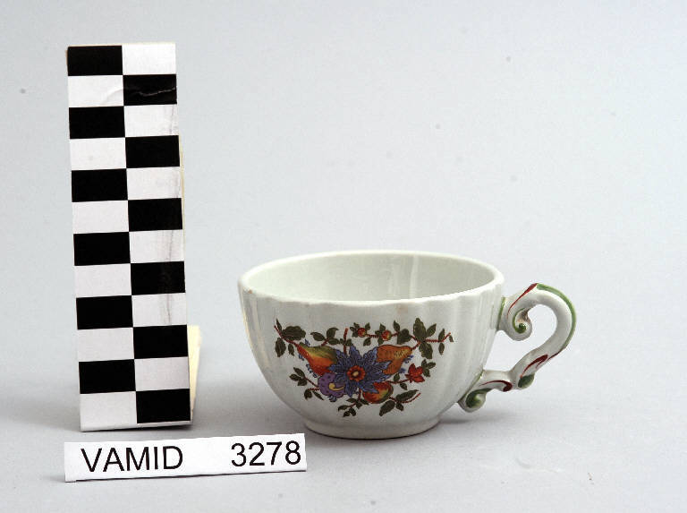 - NOTIZIE STORICO CRITICHE Il manufatto in esame, appartenente ad un servizio da caffè (nn. inv. 3269-3278, 3345), è realizzato nella forma denominata "Vecchio Pescara". Si tratta di una forma tradizionale settecentesca che Andlovitz rivisita, pur nel rispetto della sua classicità. Esistono dei disegni per i servizi da thè e da caffè firmati dal designer che recano la data 1943. Il servizio si caratterizza per un bordo che termina con sei profili, la cui ondulazione è ripresa anche nel cavetto. Il pomolo dei coperchi è costituito da un insieme di frutti; i manici sono mossi e arricciolati; l'intero corpo dei pezzi per il servizio da tavola è mosso da costolature verticali. Il motivo certamente più diffuso è quello con fiori e frutti, decoro "6727". Poichè il servizio non è presente nel catalogo del 1926, in quello del 1938 e in quello del 1940-1943 mentre sono noti i disegni datati 1943, si può ipotizzare che la rielaborazione del servizio "Vecchio Pescara" risalga ai primi anni degli anni Quaranta. Per la tazza in esame un sicuro termine di datazione è fornito dal marchio presente sul fondo che risulta impresso dalla Richard Ginori su tutte quelle terraglie prodotte nello stabilimento di Laveno tra il 1965 e il 1975 circa. Quindi si ipotizza che il manufatto sia stato realizzato in questo lasso cronologico nella forma ideata dall'Andlovitz nel 1943. Nel Midec è conservato un servizio di piatti composto da due elementi realizzato dalla "S.C.I." nella forma "Vecchio Pescara" (num. inv. 3393, 3728.