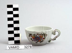 Tazzina da caffè con corpo leggermente svasato; manico a "C" schiacciato decorato con piccole volute contrapposte; fondo bianco con motivo decorativo vegetale policromo all'esterno.