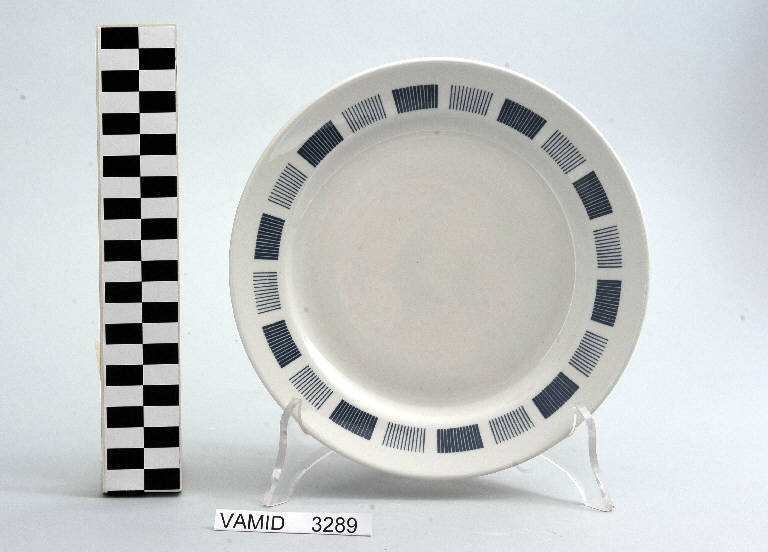 - NOTIZIE STORICO CRITICHE La foggia del manufatto in esame e la tipologia del decoro indicano una piena assimilazione della lezione del funzionalismo e quindi una datazione ormai avanzata nel Novecento confermata anche dal marchio presente sul fondo usato dalla Richard Ginori dal 1950 al 1990 circa. Il piatto, appartenente ad un servizio da tavola (num. inv. 3286...3658), fa parte di una donazione di privati al Museo.