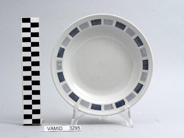 Piatto fondo circolare; fondo bianco con motivi decorativi geometrici stilizzati in blu lungo l'ala.