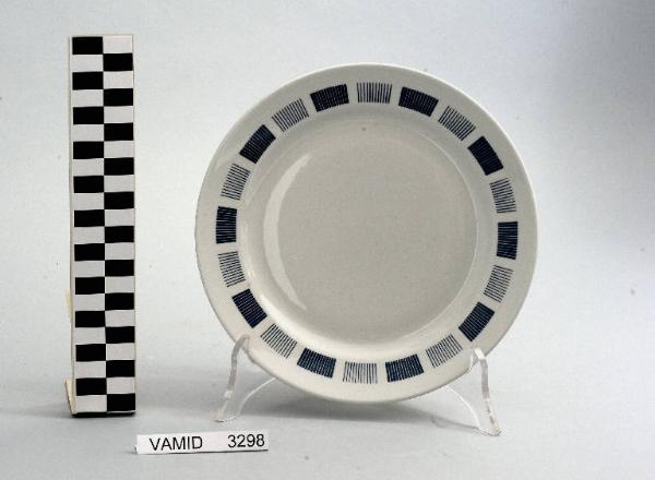 - NOTIZIE STORICO CRITICHE La foggia del manufatto in esame e la tipologia del decoro indicano una piena assimilazione della lezione del funzionalismo e quindi una datazione ormai avanzata nel Novecento confermata anche dal marchio presente sul fondo usato dalla Richard Ginori dal 1950 al 1990 circa. Il piatto, appartenente ad un servizio da tavola (num. inv. 3286...3658), fa parte di una donazione di privati al Museo.