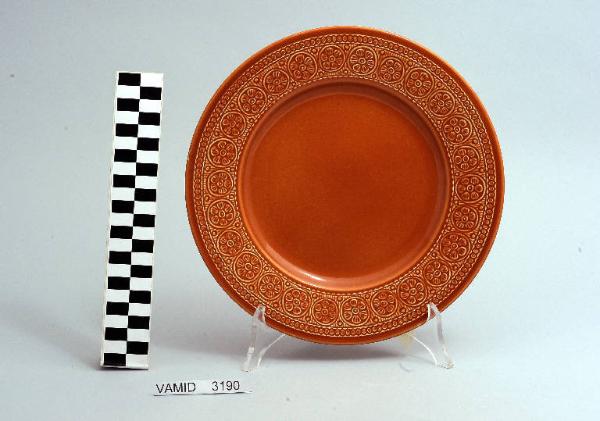 Piatto piano circolare fondo color terracotta; motivi decorativi geometrici e vegetali a rilievo lungo la tesa.