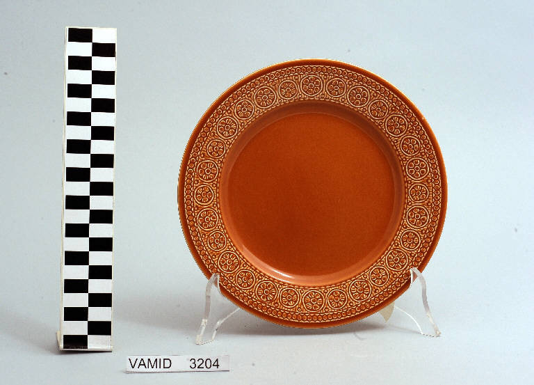 Piatto da frutta circolare color terracotta; motivi decorativi geometrici e vegetali a rilievo lungo la tesa.