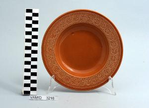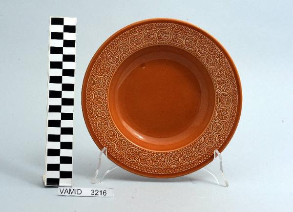 Piatto fondo circolare color terracotta; motivi decorativi geometrici e vegetali a rilievo lungo la tesa.