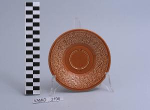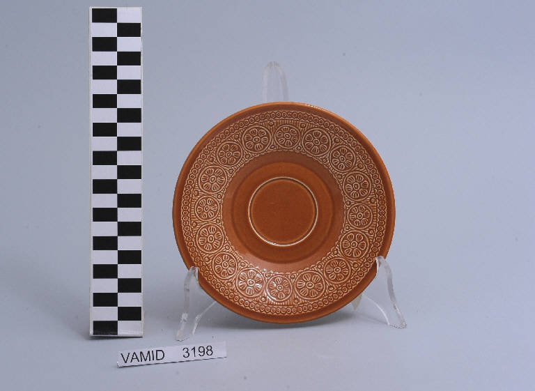 Piattino da thè circolare color terracotta; motivi decorativi geometrici e vegetali a rilievo lungo la tesa.
