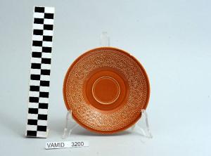 Piattino da thè circolare color terracotta; motivi decorativi geometrici e vegetali a rilievo lungo la tesa.