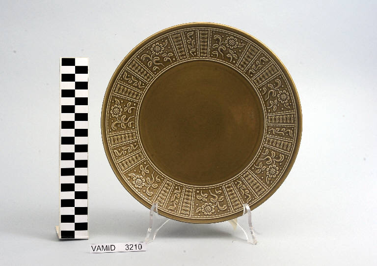 Piatto piano circolare color marrone; motivi decorativi geometrici e vegetali a rilievo lungo la tesa.