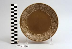 Piatto piano circolare color marrone; motivi decorativi geometrici e vegetali a rilievo lungo la tesa.
