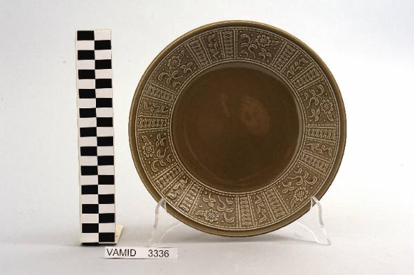 Piatto fondo circolare color marrone; motivi decorativi geometrici e vegetali a rilievo lungo la tesa.