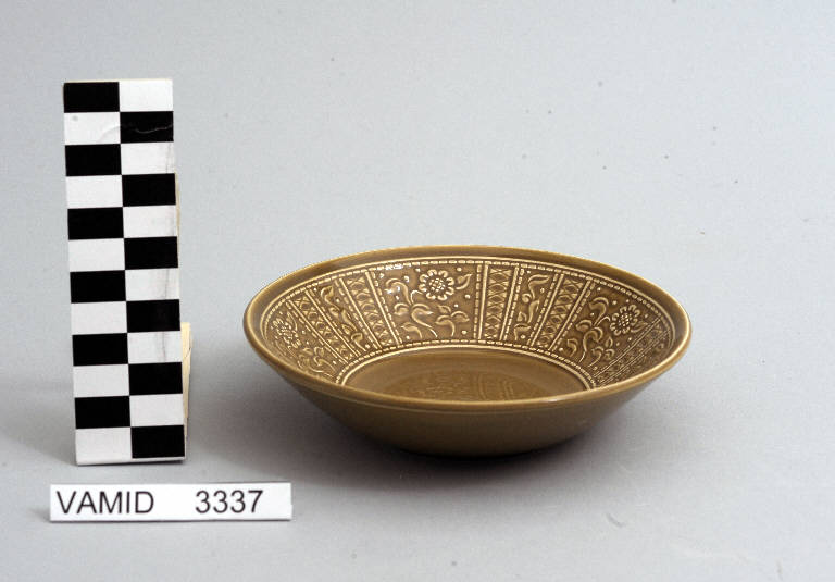 Ciotola circolare color marrone; motivi decorativi geometrici e vegetali a rilievo lungo il bordo interno.