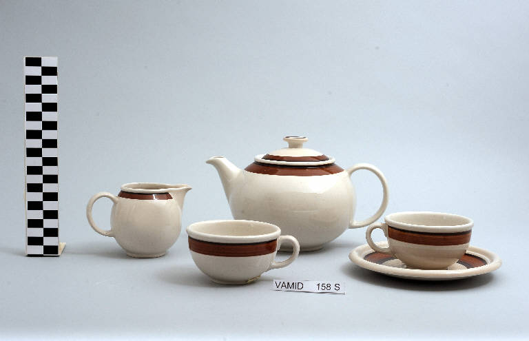 Servizio da thè composto da due tazze, un piattino, una lattiera e una teiera; fondo bianco avorio decorato con fascia marrone.