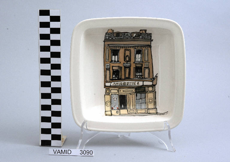 - NOTIZIE STORICO CRITICHE La ciotola in esame, appartenente ad un servizio da frutta composto da tre elementi (nn. inv. 3089-3091), è realizzata nella forma "Orvieto". Si tratta di un servizio, nel quale il piatto diventa quadrato, che viene presentato da Guido Andlovitz alla VII Triennale del 1940. Nella versione illustrata sul catalogo della SCI il servizio è arricchito da un motivo pittorico monocromo, che riproduce soggetti e paesaggi marini. In questo caso il corpo ceramico è stato decorato, con la tecnica della decalcomania serigrafica applicata sottosmalto, con facciate di palazzi da Angelo Ruffoni, plasmatore e decoratore presso la Società Ceramica di Laveno a partire dagli anni Venti, intorno al 1960. Nel museo di Laveno sono conservati due vassoi (nn. inv. 805-806) e un vaso (num. inv. 459) con un simile decoro. La ciotola fa parte di una donazione.\nSecondo alcune schede tecniche custodite presso l'archivio della SCI (busta 90, fascicolo 3), il decoro fa parte della serie "Case di Parigi" con numero decoro 4310.