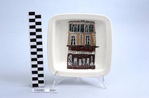 - NOTIZIE STORICO CRITICHE La ciotola in esame, appartenente ad un servizio da frutta composto da tre elementi (nn. inv. 3089-3091), è realizzata nella forma "Orvieto". Si tratta di un servizio, nel quale il piatto diventa quadrato, che viene presentato da Guido Andlovitz alla VII Triennale del 1940. Nella versione illustrata sul catalogo della SCI il servizio è arricchito da un motivo pittorico monocromo, che riproduce soggetti e paesaggi marini. In questo caso il corpo ceramico è stato decorato, con la tecnica della decalcomania serigrafica applicata sottosmalto, con facciate di palazzi da Angelo Ruffoni, plasmatore e decoratore presso la Società Ceramica di Laveno a partire dagli anni Venti, intorno al 1960. Nel museo di Laveno sono conservati due vassoi (nn. inv. 805-806) e un vaso (num. inv. 459) con un simile decoro. La ciotola fa parte di una donazione. \nSecondo alcune schede tecniche custodite presso l'archivio della SCI (busta 90, fascicolo 3), il decoro fa parte della serie "Case di Parigi" con numero decoro 4310.