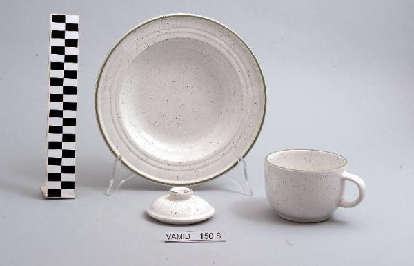 - NOTIZIE STORICO CRITICHE Il servizio in esame, composto da quattro elementi (nn. inv. 3177...3233), si inserisce in un filone di stoviglie e vasellame di gusto corrente. Lo stile funzionale ed essenziale indica una datazione all'interno della seconda metà del Novecento. La ditta che lo ha prodotto ha realizzato nel 1998 la "Serie Fumo" (portapipe, posacenere, barattoli per tabacco) del designer Ambrogio Pozzi. Tipologicamente si lega ad un servizio da thè composto da sette elementi (nn. inv. 3172...3229).\nSi tratta di una tipologia prodotta, sempre nella linea gres, anche da altre manifatture come dimostrano il servizio da tavola (num. inv. 3176...3232), quello da colazione (num. inv. 3175, 3180), quello da thè (num. inv. 3174, 3179) e quello da caffè (num. inv. 3178, 3234) conservati presso il Midec.\nIl servizio fa parte di una donazione di privati al Museo.