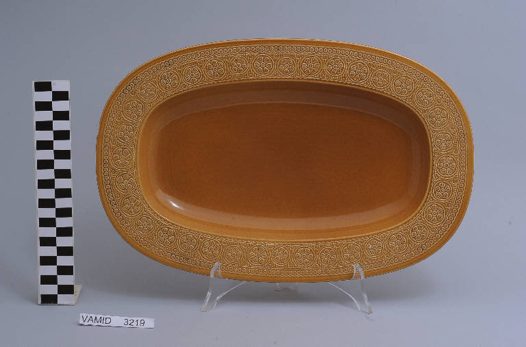 Antipastiera di forma rettangolare con angoli arrotondati; fondo color giallo aranciato; motivi decorativi geometrici e vegetali a rilievo lungo la tesa.