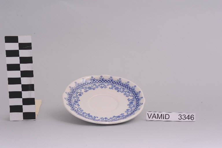 Piattino con orlo ondulato; fondo bianco decorato da maglia romboidale ornata da piccoli fiori in monocromo color blu lungo la tesa.
