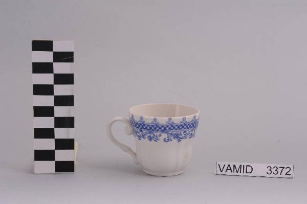 - NOTIZIE STORICO CRITICHE Il manufatto in esame, che fa parte di un servizio da caffè (num. inv. 3346-3375), si lega tipologicamente ad un piattino conservato presso il Museo (num. inv. 1435). La linea ancora classica e il decoro minuto e lezioso richiamano un gusto in voga tra Otto e Novecento. L'ornato costituito da elementi floreali e da una maglia romboidale è realizzato con la tecnica della decalcomania sottosmalto in monocromo color blu. La tazzina fa parte di una donazione di privati al Museo. Nel Midec è conservato anche un servizio da frutta con la medesima greca ornamentale in monocromo color verde (num. inv. 3406-3419).
