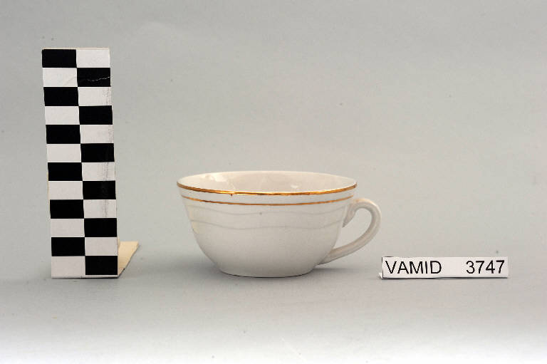 - NOTIZIE STORICO CRITICHE La tazza in esame, appartenente ad un servizio da thè (num. inv. 3746-3770), rientra in una tipologia di vasellame di gusto corrente. Il design sobrio ed elegante, il motivo ondulato a rilievo e il bordo sottolineato da leggere profilature oro che si stagliano sul fondo bianco della terraglia indicano una datazione alla prima metà del Novecento. La mancanza di caratteri stilistici particolari impedisce una definizione cronologica più circoscritta. La tazza fa parte di una donazione di privati al Museo (Rossi Renato, 3 aprile 2009). Tipologicamente si lega ad un piattino (num. inv. 1493) prodotto sempre dalla "S. C. I." ma differente nel marchio impresso sul fondo (si tratta della solita aquila ad ali spiegate con cartigli ma con iscrizione diversa) e ad un servizio da thè (num. inv. 3617...3626) nella variante color azzurro conservati presso il Midec.
