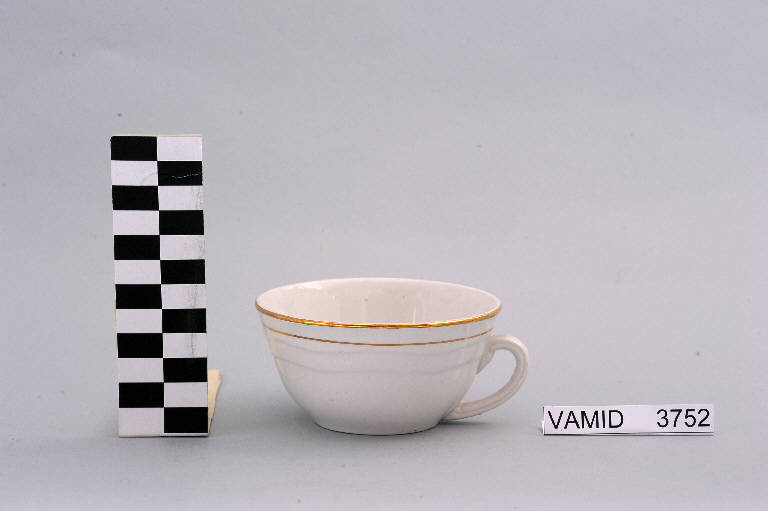 - NOTIZIE STORICO CRITICHE La tazza in esame, appartenente ad un servizio da thè (num. inv. 3746-3770), rientra in una tipologia di vasellame di gusto corrente. Il design sobrio ed elegante, il motivo ondulato a rilievo e il bordo sottolineato da leggere profilature oro che si stagliano sul fondo bianco della terraglia indicano una datazione alla prima metà del Novecento. La mancanza di caratteri stilistici particolari impedisce una definizione cronologica più circoscritta. La tazza fa parte di una donazione di privati al Museo (Rossi Renato, 3 aprile 2009). Tipologicamente si lega ad un piattino (num. inv. 1493) prodotto sempre dalla "S. C. I." ma differente nel marchio impresso sul fondo (si tratta della solita aquila ad ali spiegate con cartigli ma con iscrizione diversa) e ad un servizio da thè (num. inv. 3617...3626) nella variante color azzurro conservati presso il Midec.