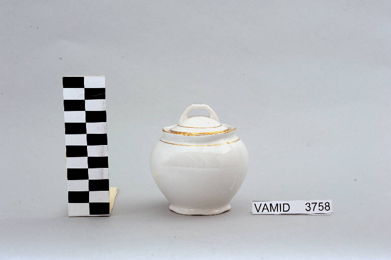 - NOTIZIE STORICO CRITICHE La zuccheriera in esame, appartenente ad un servizio da thè (num. inv. 3746-3770), rientra in una tipologia di vasellame di gusto corrente. Il design sobrio ed elegante, il profilo ondulato e il bordo sottolineato da leggere profilature oro che si stagliano sul fondo bianco della terraglia indicano una datazione alla prima metà del Novecento. La mancanza di caratteri stilistici particolari impedisce una definizione cronologica più circoscritta. La zuccheriera fa parte di una donazione di privati al Museo (Rossi Renato, 3 aprile 2009). Tipologicamente si lega ad un piattino (num. inv. 1493) prodotto sempre dalla "S. C. I." ma differente nel marchio impresso sul fondo (si tratta della solita aquila ad ali spiegate con cartigli ma con iscrizione diversa) e ad un servizio da thè (num. inv. 3617...3626) nella variante color azzurro conservati presso il Midec.