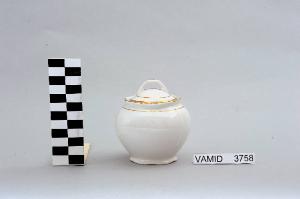 Zuccheriera di colore bianco con corpo globulare; restringimento in prossimità dell'imboccatura leggermente svasata; coperchio circolare con presa apicale; bordi rifiniti con filettatura oro.