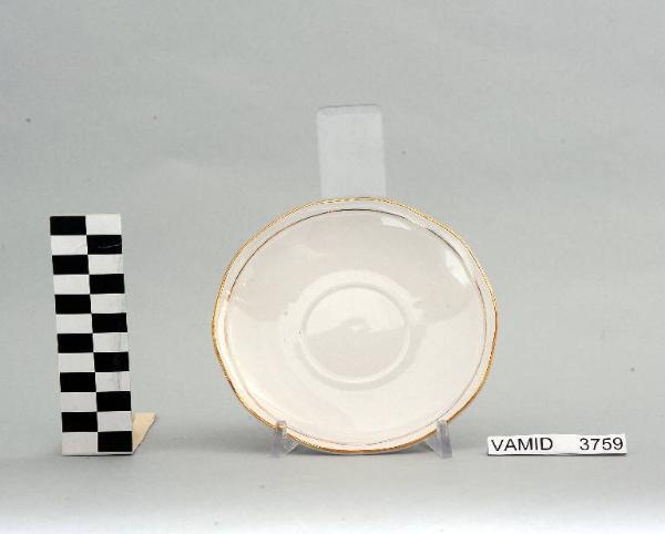 - NOTIZIE STORICO CRITICHE Il piattino in esame, appartenente ad un servizio da thè (num. inv. 3746-3770), rientra in una tipologia di vasellame di gusto corrente. Il design sobrio ed elegante, la linea ondulata e il bordo sottolineato da leggere profilature oro che si stagliano sul fondo bianco della terraglia indicano una datazione alla prima metà del Novecento. La mancanza di caratteri stilistici particolari impedisce una definizione cronologica più circoscritta. Il piattino fa parte di una donazione di privati al Museo (Rossi Renato, 3 aprile 2009). Tipologicamente si lega ad un piattino (num. inv. 1493), prodotto sempre dalla "S. C. I." ma differente nel marchio impresso sul fondo (si tratta della solita aquila ad ali spiegate con cartigli ma con iscrizione diversa), ad un servizio da thè nella variante color azzurro (num. inv. 3617...3626) e ai piattini di un altro servizio da thè color azzurro (num. inv. 3613...3627) conservati presso il Midec.
