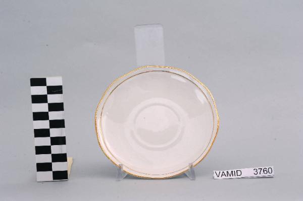 - NOTIZIE STORICO CRITICHE Il piattino in esame, appartenente ad un servizio da thè (num. inv. 3746-3770), rientra in una tipologia di vasellame di gusto corrente. Il design sobrio ed elegante, la linea ondulata e il bordo sottolineato da leggere profilature oro che si stagliano sul fondo bianco della terraglia indicano una datazione alla prima metà del Novecento. La mancanza di caratteri stilistici particolari impedisce una definizione cronologica più circoscritta. Il piattino fa parte di una donazione di privati al Museo (Rossi Renato, 3 aprile 2009). Tipologicamente si lega ad un piattino (num. inv. 1493), prodotto sempre dalla "S. C. I." ma differente nel marchio impresso sul fondo (si tratta della solita aquila ad ali spiegate con cartigli ma con iscrizione diversa), ad un servizio da thè nella variante color azzurro (num. inv. 3617...3626) e ai piattini di un altro servizio da thè color azzurro (num. inv. 3613...3627) conservati presso il Midec.