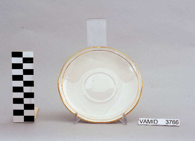 - NOTIZIE STORICO CRITICHE Il piattino in esame, appartenente ad un servizio da thè (num. inv. 3746-3770), rientra in una tipologia di vasellame di gusto corrente. Il design sobrio ed elegante, la linea ondulata e il bordo sottolineato da leggere profilature oro che si stagliano sul fondo bianco della terraglia indicano una datazione alla prima metà del Novecento. La mancanza di caratteri stilistici particolari impedisce una definizione cronologica più circoscritta. Il piattino fa parte di una donazione di privati al Museo (Rossi Renato, 3 aprile 2009). Tipologicamente si lega ad un piattino (num. inv. 1493), prodotto sempre dalla "S. C. I." ma differente nel marchio impresso sul fondo (si tratta della solita aquila ad ali spiegate con cartigli ma con iscrizione diversa), ad un servizio da thè nella variante color azzurro (num. inv. 3617...3626) e ai piattini di un altro servizio da thè color azzurro (num. inv. 3613...3627) conservati presso il Midec.