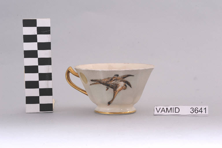 - NOTIZIE STORICO CRITICHE La foggia della tazza, appartenente ad un servizio da thè composto da ventisette elementi (num. inv. 2117...3645), suggerisce una datazione tra gli anni '30 e '40 del Novecento. La decorazione, come riporta l'iscrizione presente sul fondo di alcuni pezzi del servizio, è stata invece eseguita soprasmalto qualche anno più tardi (nel 1946) da Rosetta Tamburini, decoratrice attiva a Pesaro. La tazza fa parte di una donazione di privati al Museo.