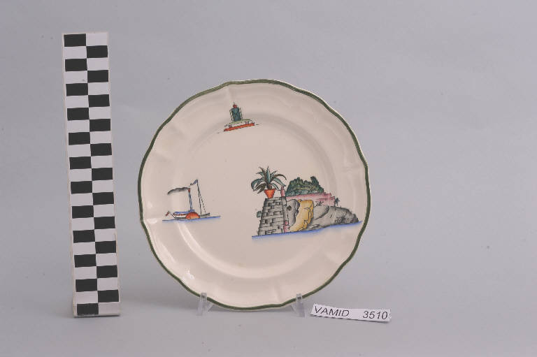 • NOTIZIE STORICO CRITICHE Il piatto, in serie con altri aventi decori diversi, fa parte di un servizio da tavola della forma "Vecchio Milano" con decoro "Lago Maggiore" n. 6641 (num. inv. 2051...3517). In questo esemplare sono raffigurati elementi caratteristici della vita sul lago (un attracco con scaletta e piante, un battello a vapore in navigazione e una boa luminosa) rappresentati in un'atmosfera sospesa e silenziosa, seppur ridente nella resa stilizzata e nel fresco cromatismo delle raffigurazioni. In terraglia forte il servizio "Vecchio Milano" venne prodotto dalla "S.C.I." a partire dal 1923. Il fatto che il decoro "Lago Maggiore" non sia riportato sul catalogo del 1926 induce a pensare che sia stato creato dall'Andlovitz dopo questa data. La sua ideazione, pertanto, viene a collocarsi molto probabilmente tra il 1926 e il 1927, cioè tra il catalogo aziendale e la nascita della nuova forma per la III Biennale di Monza. Nel 1931 l'Andlovitz, che fin dalla sua nomina a direttore artistico si prefisse di rigenerare le forme tradizionali con decori nuovi, adattò alla forma "Vecchio Milano" il nuovissimo decoro "Lago Maggiore", a conferma che una decorazione nuova, se concepita organicamente, può conferire un aspetto attuale e "scattante" anche a una bella forma tradizionale. Nell'ambito dei repertori decorativi creati dall'Andlovitz il decoro "Lago Maggiore" rappresenta un modo frazionato di raffigurare il paesaggio, definito da Mario Munari a "scena spezzata". L'impianto decorativo di queste ceramiche rifugge dalla centralità e dalle strutturazioni lungo direttrici ortogonali, mentre vi predominano l'asimmetria e le fughe visuali sghembe che risentono del gusto per la cineseria e il giapponismo. La semplificazione geometrica degli elementi e il modo di sfumare i corpi nel'intento di suggerirne la volumetria ricorda le opere di Carlo Carrà degli anni venti. Nel decoro "Lago Maggiore" sono presenti espressioni diversificate di un tema molto caro a Guido Andlovitz: i "paesaggi d'acqua" con particolare ricorrenza delle 'barche' raffigurate in una vasta gamma di tipi, generalmente riprese da modelli reali e con divertenti variazioni fantastiche. Il decoro "Lago" fu applicato in un primo momento sulla forma "Vecchio Milano", poi sulla forma "Pomezia" (1936 ca.). Di tale decoro esistono diversi disegni originali a matita, pastello, inchiostro e acquerello su carta conservati nel fondo archivistico della "S.C.I.": alcuni di questi raffigurano il decoro proprio sulla forma "Vecchio Milano" con le rifiniture che compaiono sui pezzi finiti. Nel Museo sono conservati anche un servizio da tavola (num. inv. 2667...2911) e un servizio da caffè (num. inv. 2672...2900) forma "Vecchio Milano" con decoro "Lago Maggiore" con filettaura policroma. Negli anni '90 la Richard Ginori ha rimesso in produzione il servizio "Lago". \nIl servizio in esame è eseguito a colaggio, mentre i decori sono realizzati a decalcomania e dipinti a mano: si vedano a tal proposito le lastre in rame acciaiato conservate nel Midec e raffiguranti molti dei decori presenti nel servizio in combinazioni diversificate (nn. inv. 2480, 2483, 2484, 2485).\nIl piatto fa parte di una donazione di privati al Museo (Bellorini e Porta, 2003).