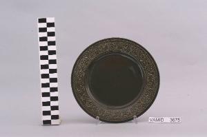 Piatto da frutta circolare color verde scuro con motivi decorativi geometrici e vegetali a rilievo lungo la tesa.