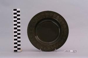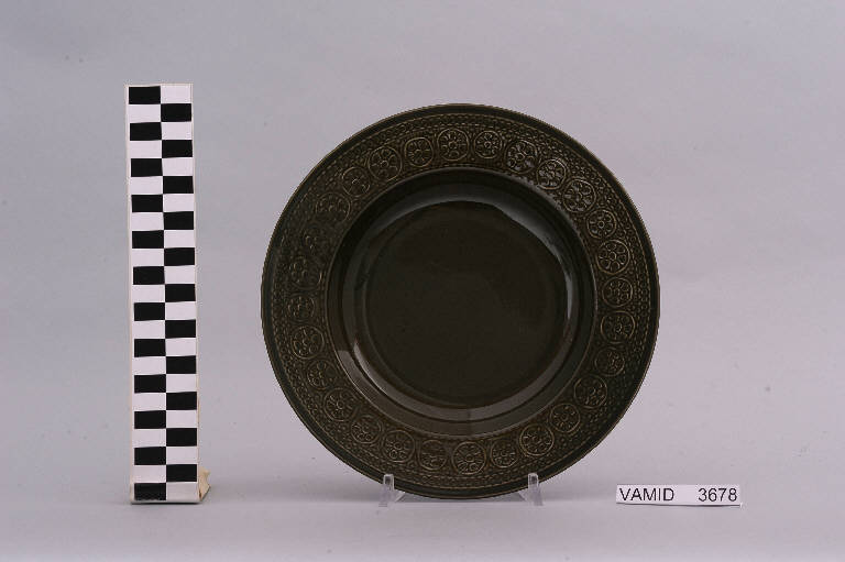 Piatto fondo circolare color verde scuro con motivi decorativi geometrici e vegetali a rilievo lungo la tesa.