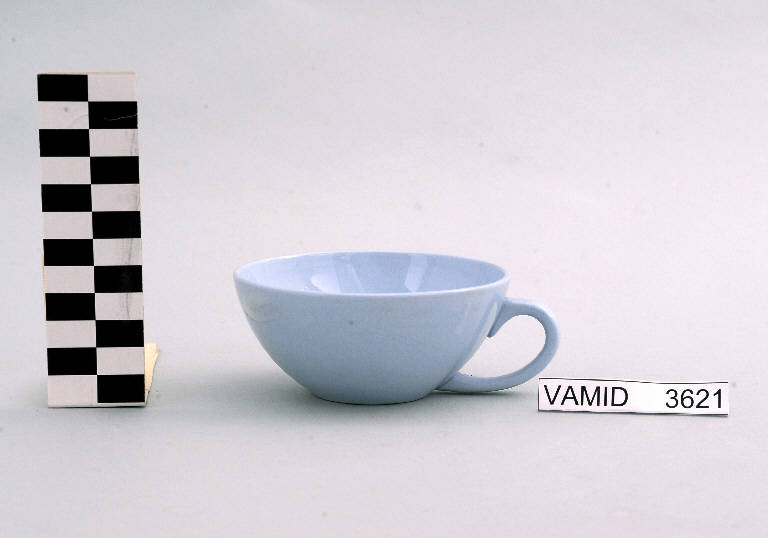 - NOTIZIE STORICO CRITICHE L'oggetto in esame, prodotto serialmente anche in altri colori, appartiene ad un servizio da thè (num. inv. 3608...3621). Il design semplice ed essenziale, che sembra vagamente ricordare la pulizia della forma "Pomezia", indica una piena assimilazione del funzionalismo e quindi una datazione ormai avanzata nel Novecento. Si tratta di una produzione, probabilmente influenzata dai progetti dell'Andlovitz, riferibile alla metà del secolo. Nel Midec è conservato un servizio da thè identico nella variante color verde (num. inv. 3604...3631). La tazza fa parte di una donazione di privati al Museo.