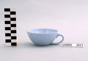 Tazza da thè troncoconica, aperta e leggermente bombata; manico a "C"; fondo azzurro uniforme.