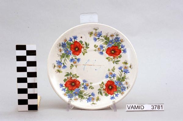 Piattino da thè circolare; fondo bianco con decoro floreale policromo disposto regolarmente.