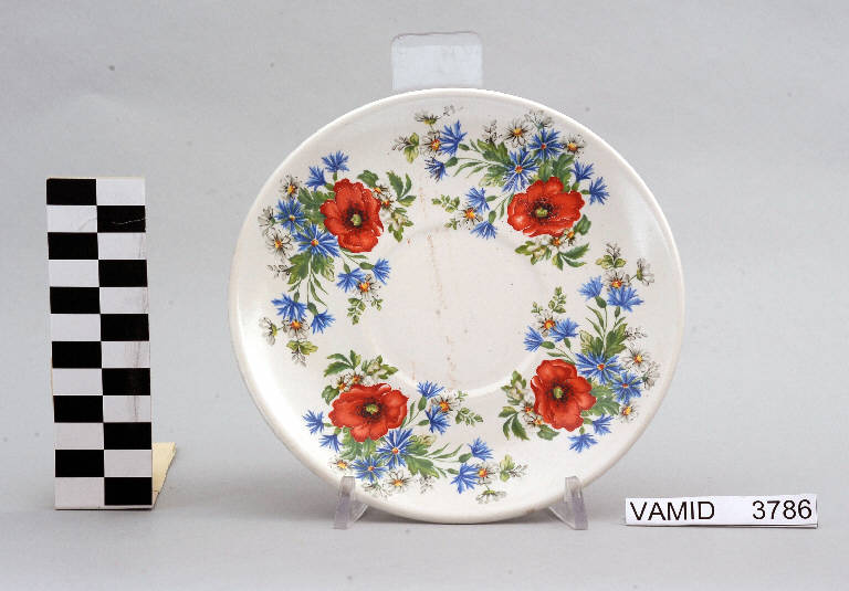 - NOTIZIE STORICO CRITICHE Il piattino in esame, appartenente ad un servizio da thè (num inv. 3781...3807), è realizzato nella forma denominata "C 205" progettata da Antonia Campi e pubblicata tra i disegni tecnici della "S.C.I." del 1953 (cfr. E. Biffi Gentili, 1998). La decorazione floreale, resa con morbidi effetti di chiaroscuro e con una policromia ricca e sfumata realizzata con la tecnica della decalcomania soprasmalto, richiama quei decori naturalistici in voga all'inizio del secolo. Il medesimo decoro è presente su un servizio da caffè (num. inv. 3787...3792) e su un vasetto (num. inv. 3150) conservati presso il Midec. Il piattino fa parte di una donazione di privati al Museo.