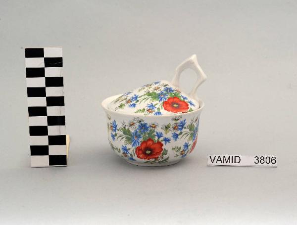 Zuccheriera a sezione poligonale con restringimento in prossimità del piede e bordo superiore leggermente estroflesso; coperchio con manico mistilineo; fondo bianco decorato con bouquets di papaveri e fiori di campo policromi disposti regolarmente all'esterno del recipiente e sul coperchio.