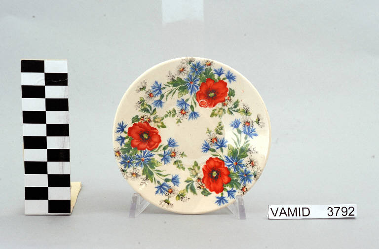 - NOTIZIE STORICO CRITICHE Il piattino in esame, appartenente ad un servizio da caffè (num inv. 3787...3805), presenta un motivo floreale di tipo tradizionale, costituito da bouquets di papaveri, violette e margherite disposti regolarmente, reso con morbidi effetti di chiaroscuro e con una policromia ricca e sfumata realizzata con la tecnica della decalcomania soprasmalto. La foggia del manufatto, utilizzata sia nelle manifatture italiane come la "S.C.I" che in quelle europee come la "Villeroy & Boch", confermerebbe la datazione al 1950-1960 ca. Nel Midec sono conservati un servizio da thè realizzato nella forma "C 205" progettata da Antonia Campi (num inv. 3781...3807) e un vasetto (num. inv. 3150) che presentano il medesimo motivo ornamentale. Il piattino fa parte di una donazione di privati al Museo.