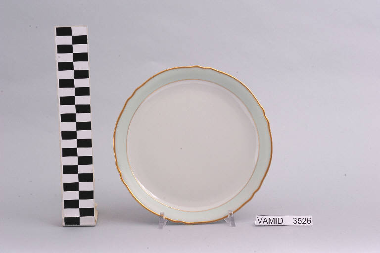 - NOTIZIE STORICO CRITICHE Il manufatto in esame, appartenente ad un servizio di piatti (num. inv. 3524-3535), rientra in una tipologia di vasellame di gusto corrente prodotto, a partire dagli anni '70, sia dalla Società Ceramica del Verbano che dalla della Richard Ginori. L'ala color verde acqua e la filettatura oro sono eseguiti soprasmalto. Il piatto fa parte di una donazione di privati al Museo.