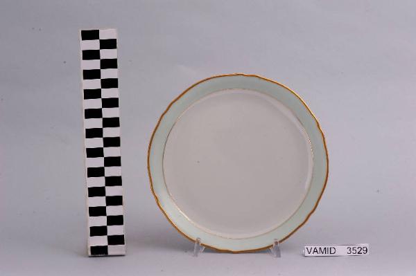 - NOTIZIE STORICO CRITICHE Il manufatto in esame, appartenente ad un servizio di piatti (num. inv. 3524-3535), rientra in una tipologia di vasellame di gusto corrente prodotto, a partire dagli anni '70, sia dalla Società Ceramica del Verbano che dalla della Richard Ginori. L'ala color verde acqua e la filettatura oro sono eseguiti soprasmalto. Il piatto fa parte di una donazione di privati al Museo.