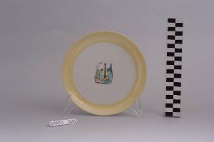 Piatto da frutta di forma circolare rifinito con alto bordo color giallo pastello; fondo bianco decorato al centro da paesaggio lacustre policromo.