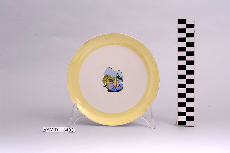 Piatto da frutta di forma circolare rifinito con alto bordo color giallo pastello; fondo bianco decorato al centro da paesaggio lacustre policromo.