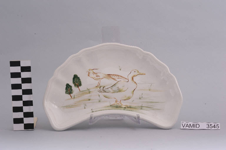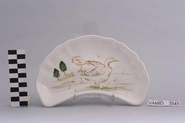 Piatto mezzaluna con orlo festonato; fondo color bianco avorio con animali policromi.