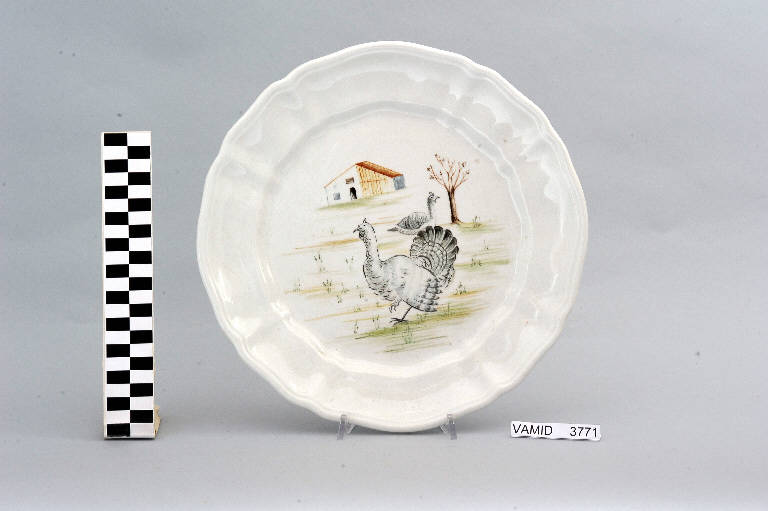 - NOTIZIE STORICO CRITICHE Il piatto, appartenente ad un servizio composto da ventiquattro elementi (num. inv. 2124...3773), è realizzato nella forma denominata "Vecchio Milano". Tale tipologia fu utilizzata negli anni '20 da Piero Portaluppi e successivamente, a partire dagli anni '30, da Guido Andlovitz con i decori "Lago Maggiore", "Vecchio Milano", "Fiori Vecchia Lodi" e "Meissen". Come risulta dal marchio impresso sul fondo, usato prima dalla Richard e poi dalla Richard Ginori su tutte le terraglie prodotte nello stabilimento di San Cristoforo tra il 1883 e il 1940 circa, il corpo ceramico fu realizzato entro il 1940 mentre la decorazione eseguita da Rosetta Tamburini, decoratrice attiva a Pesaro, risale al 1950 (cfr. l'iscrizione presente su quasi tutti gli elementi del servizio). Il piatto fa parte di una donazione di privati al Museo.