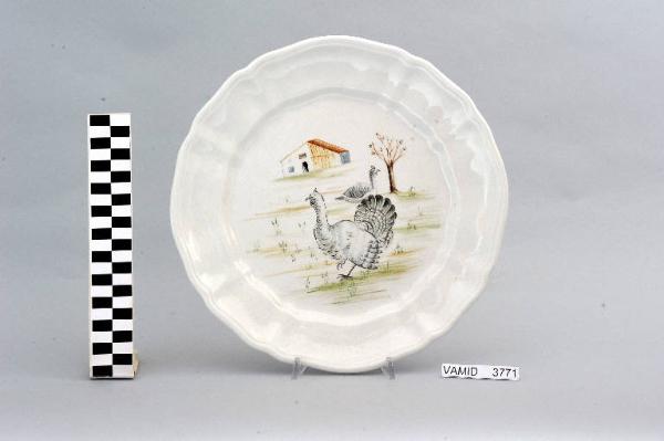 Piatto da portata circolare con tesa ondulata e bordo leggermente arcuato e modellato con una profilatura incisa; fondo color bianco avorio con animali policromi nel cavetto.