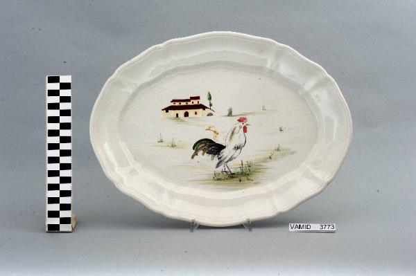 Piatto da portata ovale con tesa ondulata e bordo leggermente arcuato e modellato con una profilatura incisa; fondo color bianco avorio con animali policromi nel cavetto.
